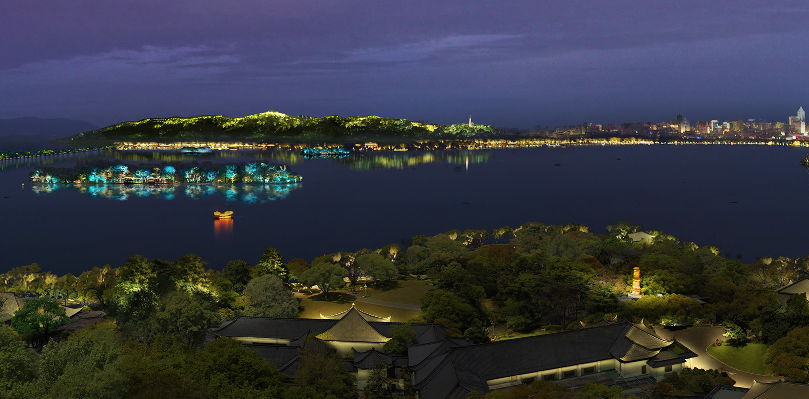 西湖南延線的山體作為G20晚會舞臺大背景,以最優雅的姿態呈現出西湖沿線自然與現代完美融合的別樣風景。 作為西湖南延線夜景觀亮燈工程的主要設計施工方,參與完成了從吳山、玉皇山、九曜山,到西子國賓館主通道、南屏山、夕照山,加上萬松書院的云居山、九華山等亮燈工程。其中“吳山亮燈工程”榮獲杭“G20”專項景觀照明一等獎,柏年公司榮獲G20峰會亮化服務先進集體和服務保障杭州G20優秀施工企業。