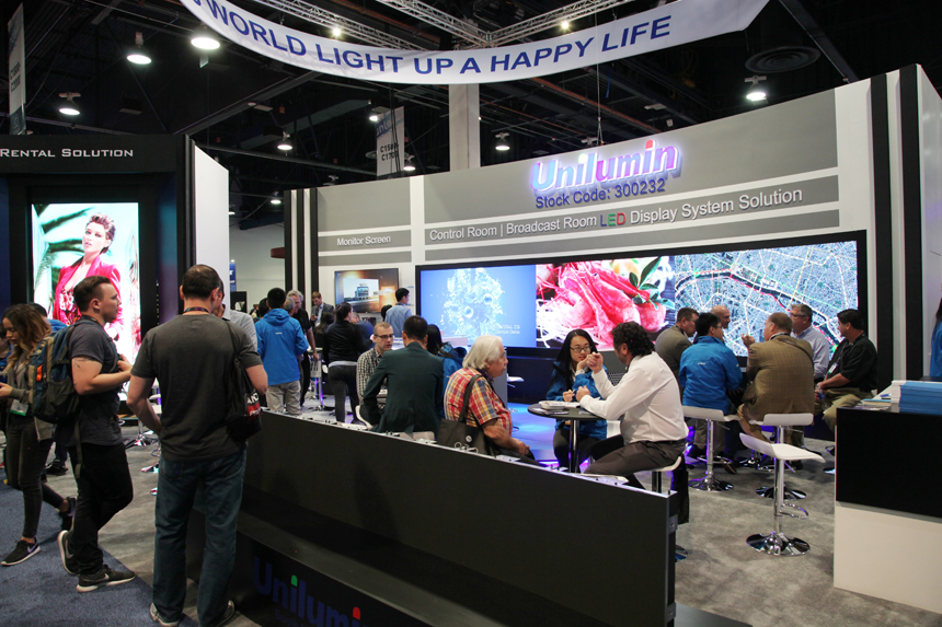 作為全世界最大的電子傳媒展,展品涉及廣播電視領域各類產品,顯示屏也是其中一個重頭戲,由中國企業掀起的高清小間距顯示屏風潮在大洋彼岸風靡一時,從本屆展會就可以看出,十幾家中國LED企業展出的小間距產品成了展會一道亮麗的風景線,洲明科技的小間距顯示屏拼接而成的巨大電視墻吸引了眾多參觀者的眼球,現場人氣旺盛。