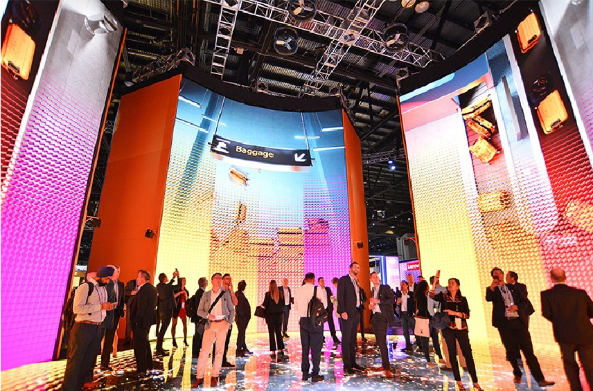中央展示區(qū)的周圍由三面洲明ROE系列Carbon LED顯示屏搭建而成的巨大弧形視頻墻組成,與酷炫LED地磚屏相結(jié)合,在LED大屏自身出色的顯示效果基礎(chǔ)上,打造出立體感十足的現(xiàn)場氛圍,沉浸式的大屏體驗吸引了在場眾多嘉賓的駐足。