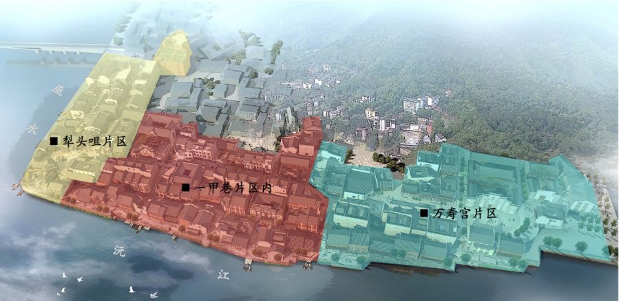 本案照明設計內容為洪江古商城核心景區“煙雨洪江”的建筑以及景觀照明。項目用地呈“7”字形,東、北兩面分別臨巫水和沅江,南面、西面為洪江古商城核心景觀區, 分為犁頭咀片區、一甲巷片區、萬壽宮片區。