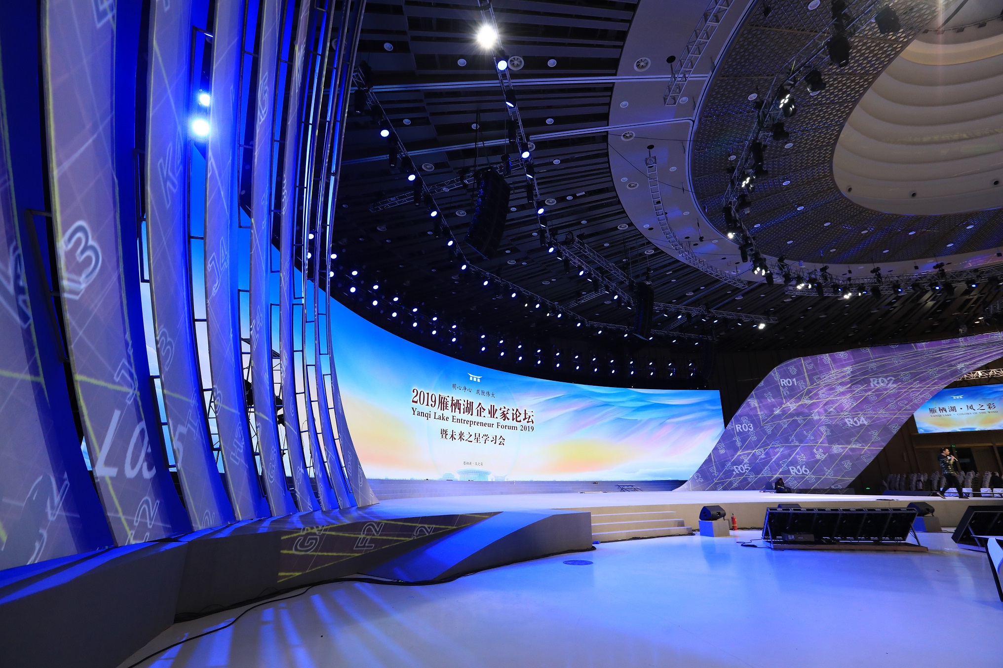 安裝完成的弧形大屏和12塊環場顯示屏,顯示畫面高清細膩,視角寬宏廣闊,瞬間成為雁棲湖國際會展中心的視覺焦點,也將成為為期7天的雁棲湖企業家論壇的呈現載體,助推新商業文明的建設,將中華文化的力量傳遞給更多的人!