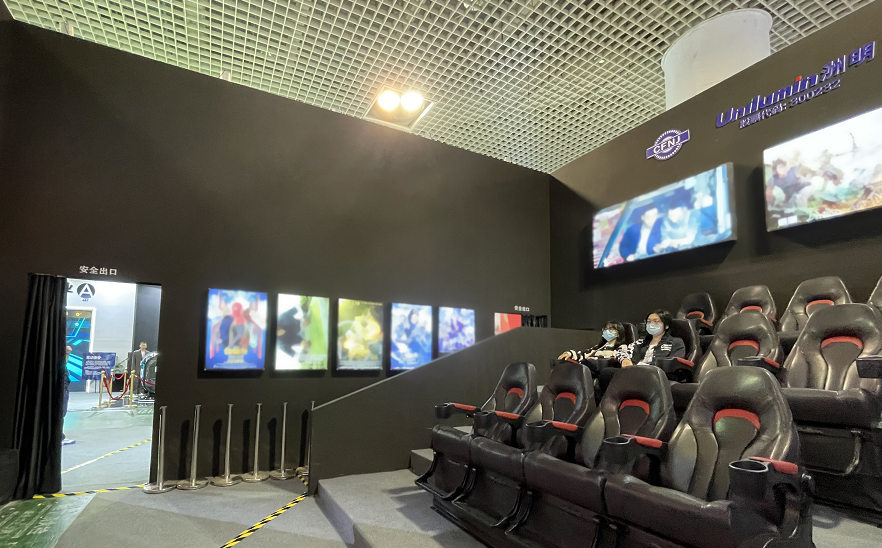 展位后部則是采用洲明紅點精品小間距——UHPⅡ顯示大屏、中影4D座椅系統共同打造的迷你電影放映廳。大屏完整還原了影片的真實細節和色彩,4D座椅系統則結合影片內容打造晃動、閃電颶風等特效場景,讓觀影人員身臨其境感受大片的震撼與刺激。