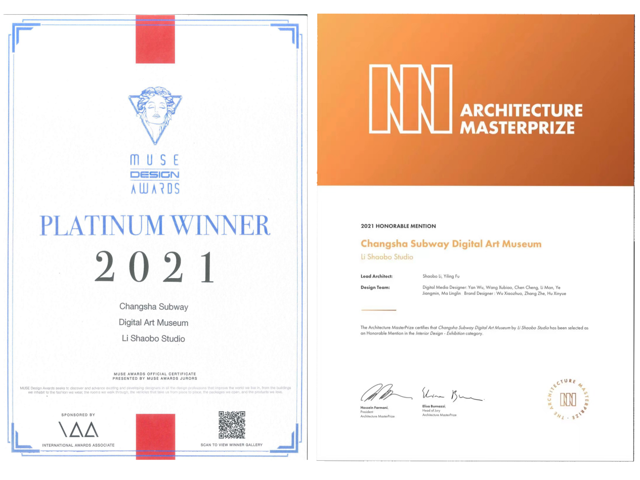 ▲“MUSE設計獎”鉑金大獎(左)和AMP美國建筑大師獎榮譽獎(右)