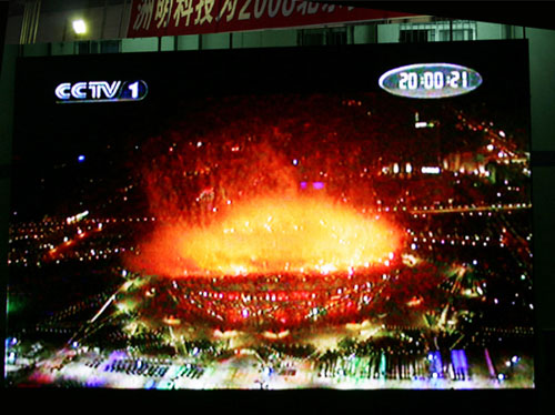 2008年8月8 日晚8點8分的開幕式,全國人民都在期待,洲明公司也提前安裝調試好一塊超大的LED戶外全彩顯示屏,裝好音響功放,拉好有線電視信號.公司行政部專門為 每個員工訂制了一面面奧運五環旗幟和中國國旗,買來飲料和水果.隨著夜幕的降臨,LED超大屏幕在整個工業區顯得格外醒目耀眼,在如此氣氛的感染下,公司 周圍的不少居民也紛至沓來,駐足觀看,共同感受奧運直播這一偉大時刻.