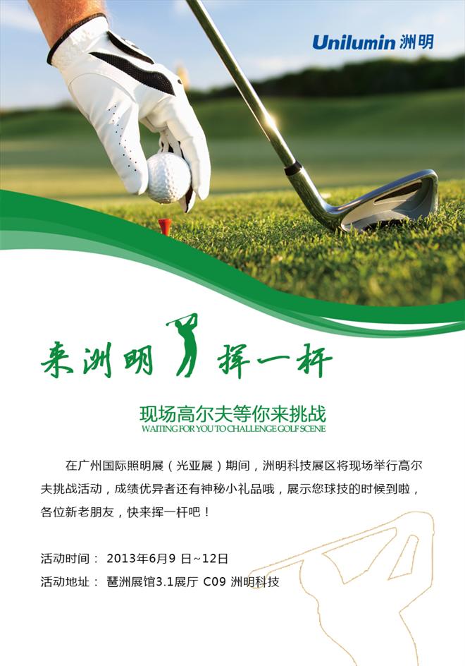 在廣州國際照明展(光亞展)期間,洲明科技展區(qū)將現(xiàn)場舉行高爾夫挑戰(zhàn)活動,成績優(yōu)異者還有神秘小禮品哦,展示您秋季的時候到啦,各位新老朋友,快來揮一桿吧!