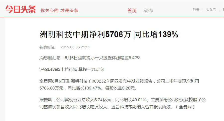 ??全景網8月6日訊 洲明科技(300232)周四發布中期業績報告,公司上半年實現凈利潤5706.88萬元,同比增長139.47%。每股收益0.28元。 報告期,公司實現營業總收入6.24億元,同比增長40.01%。主要系母公司外貿及控股子公司雷迪奧銷售收入同比增長幅度較大、藍普科技本期納入合并報表所致。(全景網)???????