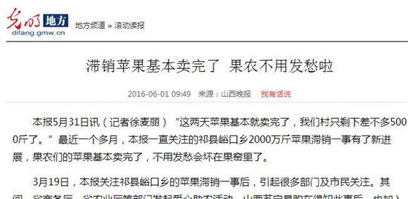 可是前段時間,“山西蘋果滯銷”的話題卻一度刷爆網(wǎng)絡(luò),萬噸大豐收,對應(yīng)的卻是千萬果農(nóng)的滿面憂愁。果農(nóng)家庭的經(jīng)濟(jì)來源至少有一半來自于蘋果,孩子的婚事,老人的贍養(yǎng),大病的醫(yī)療等等都指望著家里的蘋果。蘋果賣不出,面對農(nóng)產(chǎn)品滯銷危機(jī)再一次爆發(fā),暖春對他們來說也變得寒冷刺骨……